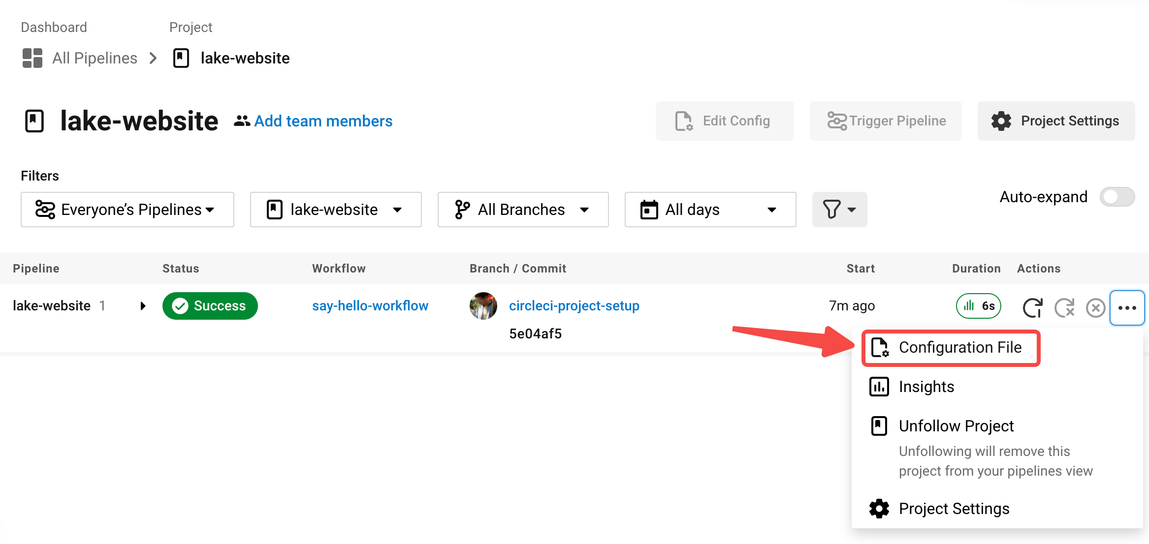 2.3 Head to your CircleCI's pipelines page in a new tab. Find your deployment pipeline and click Configuration File.