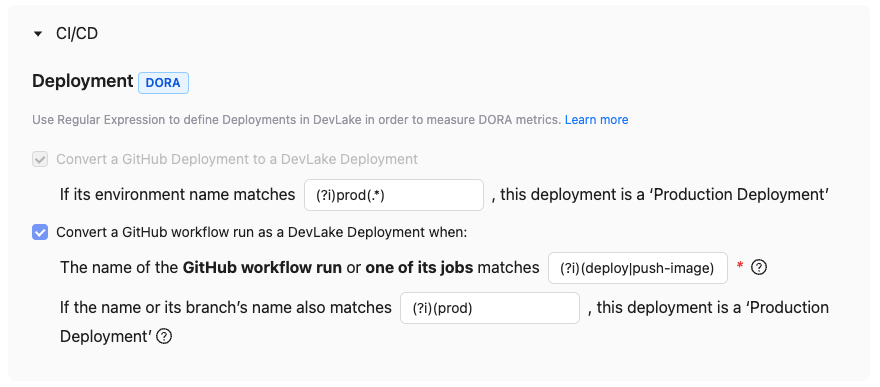 To make it simple, fields with the label are DORA-related configurations for every data source. Via these fields, you can define what "incidents" and "deployments" are for each data source.