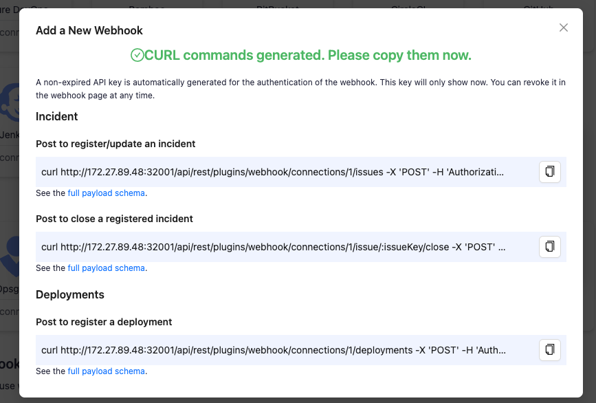 2.2 Copy the curl command to register deployments to Truxt. This curl command includes a non-expired API key generated automatically.