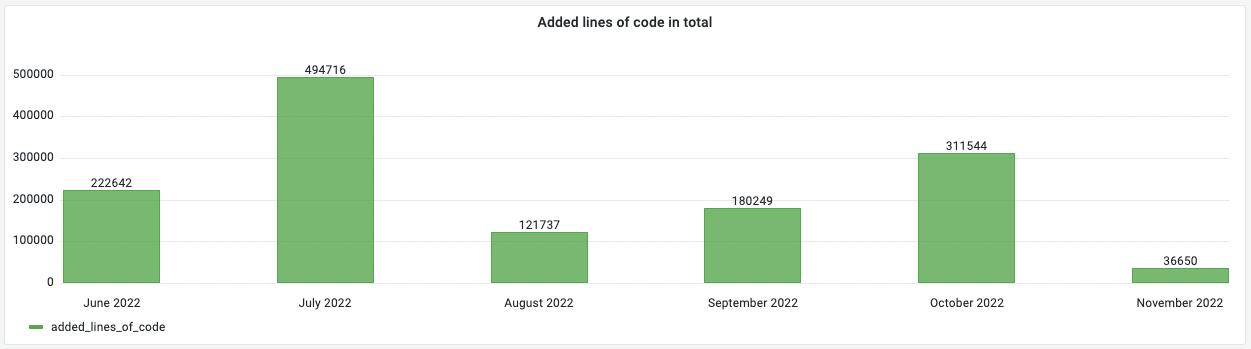 If you want to measure the monthly trend of added lines of code in the screenshot below, please run the following SQL in Grafana.