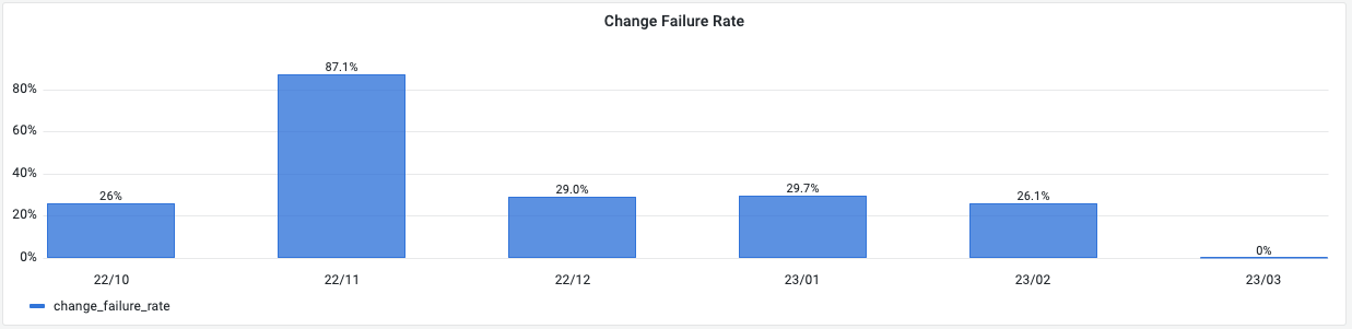 Unlike Deployment Frequency and Lead Time for Changes that measure the throughput, Change Failure Rate measures the stability and quality of software delivery. A high CFR reflects a bad end-user experience as the production failure is relatively high.