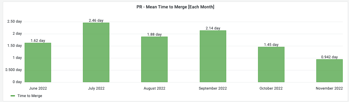 If you want to measure the monthly trend of PR time to merge in the screenshot below, please run the following SQL in Grafana.