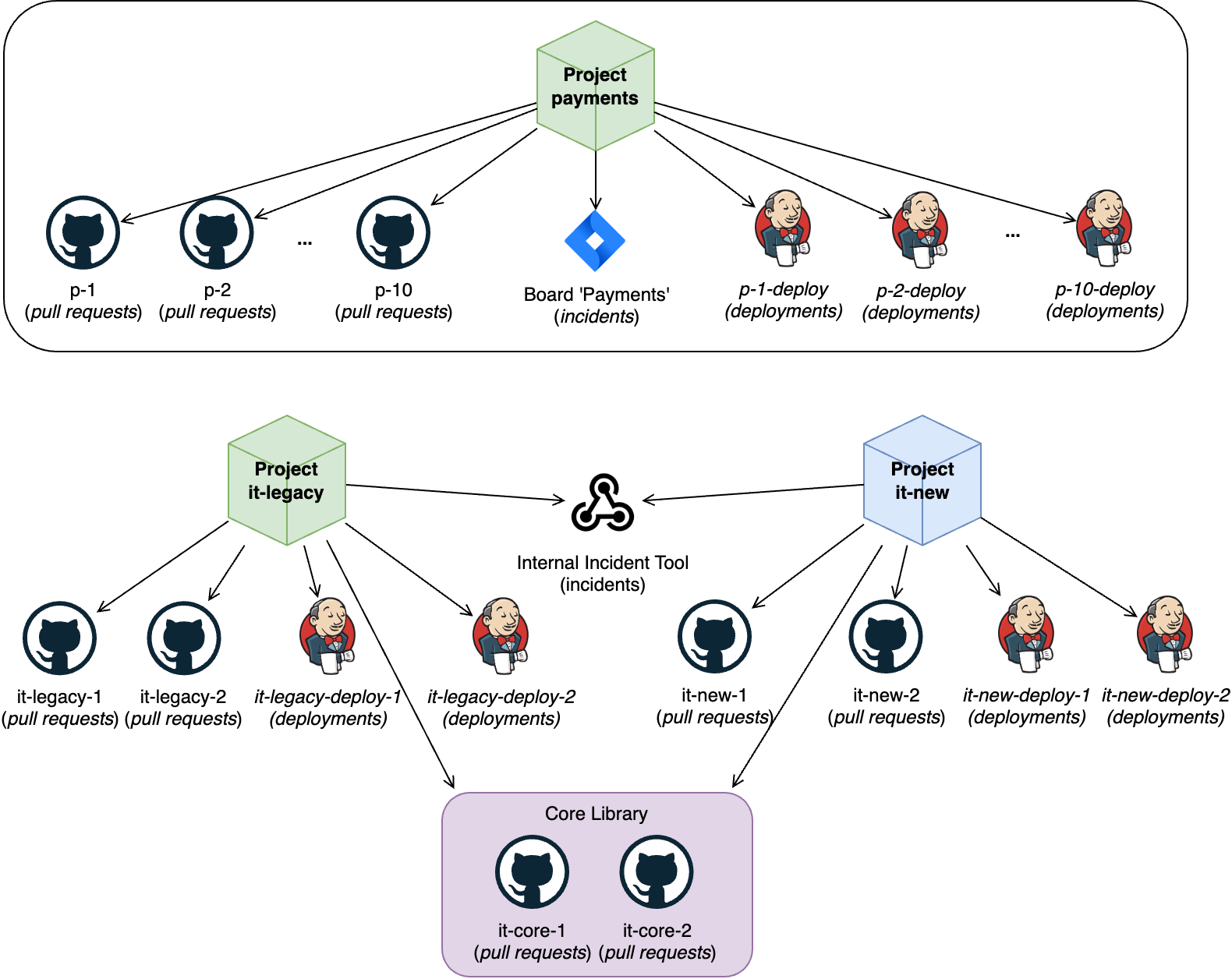 • Having a Git repo, issue board, or CI/CD pipeline associated with multiple projects, such as in the case of mono-repos or boards used to track incidents from user feedback.