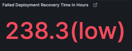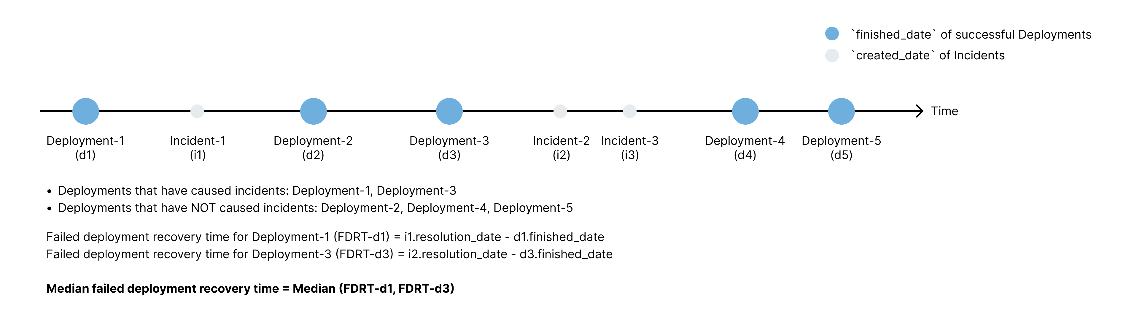The time from deployment to the incident corresponding to deployment is resolved. For example, if a deployment finishes at 10:00 AM and causes an incident at 10:20. Then, the incident gets resolved at 11:00 AM. The failed deployment recovery time is one hour.